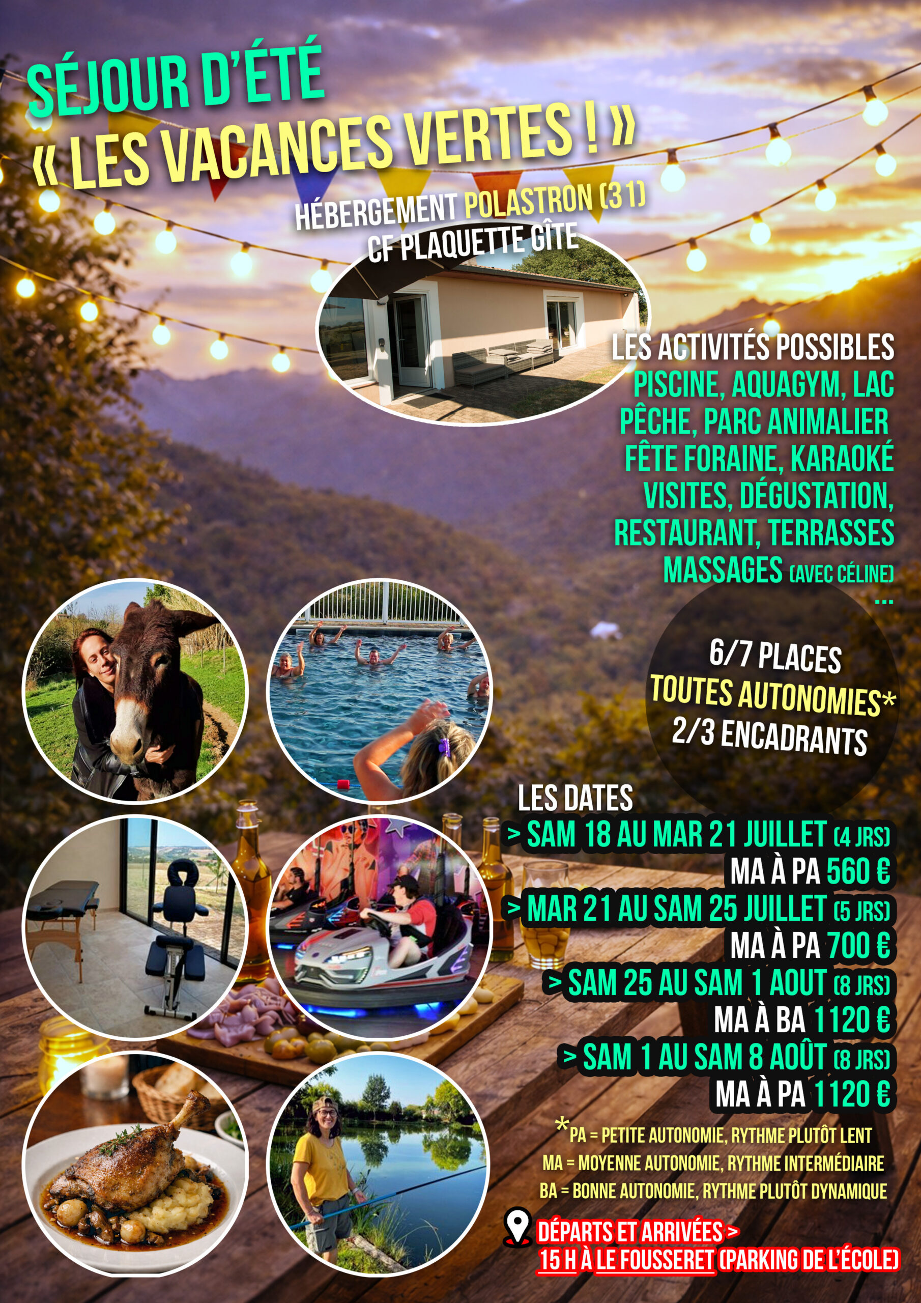 « Les vacances vertes », un programme qui conviendra plutôt aux amateurs de détente mais aussi de sorties festives. Plusieurs périodes disponibles